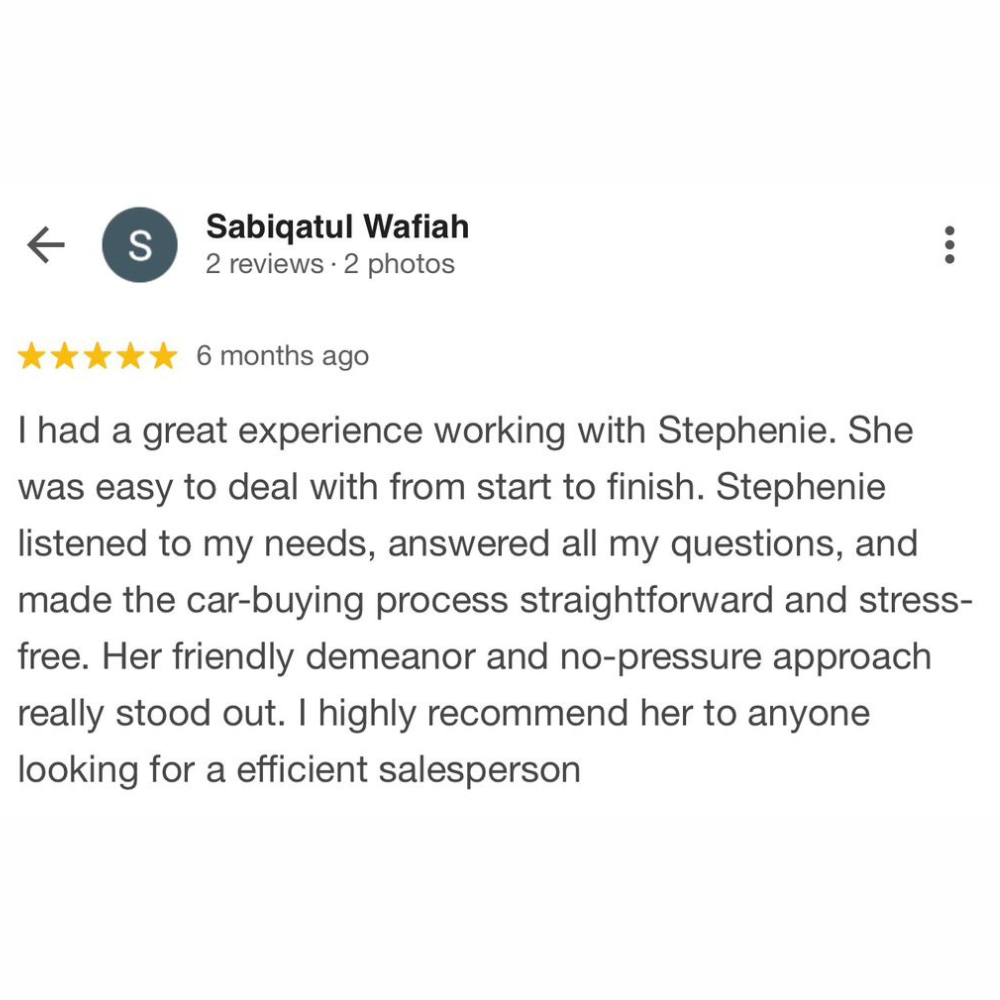 I provide personalised consultation, clear product explanations, and transparent advice to ensure every customer can make a confident and informed decision. From initial enquiry to vehicle delivery, my focus is on delivering a smooth and reliable car-buying experience.